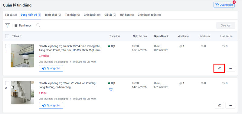 Bước 2: Tìm tin đăng mà bạn muốn sửa.