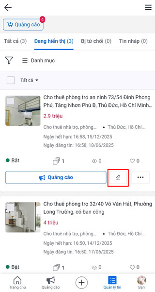 Bước 3: Sau khi tìm được tin mà bạn muốn sửa, hãy nhấn vào biểu tượng cây bút phía dưới tin đăng.