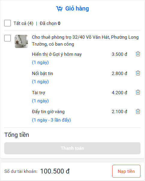 Đặc biệt, NhadatVui mang đến tính năng thanh toán linh hoạt, cho phép bạn tùy ý chọn thanh toán một dịch vụ, một nhóm dịch vụ, hoặc toàn bộ các dịch vụ trong giỏ hàng cùng lúc. Việc này không chỉ giúp bạn tiết kiệm thời gian mà còn đảm bảo rằng bạn có thể điều chỉnh ngân sách phù hợp với nhu cầu quảng cáo tại từng thời điểm.