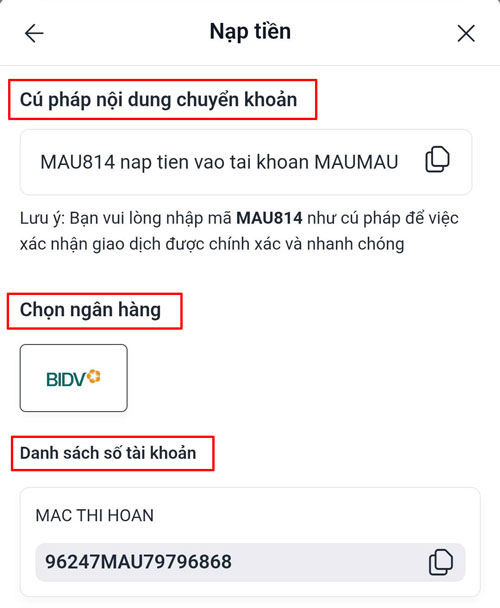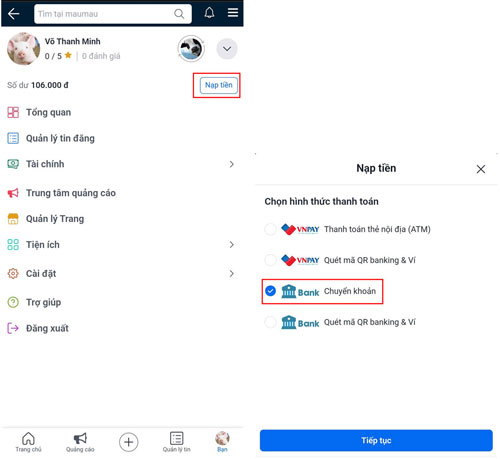 Nạp tiền vào tài khoản bằng cách chuyển khoản