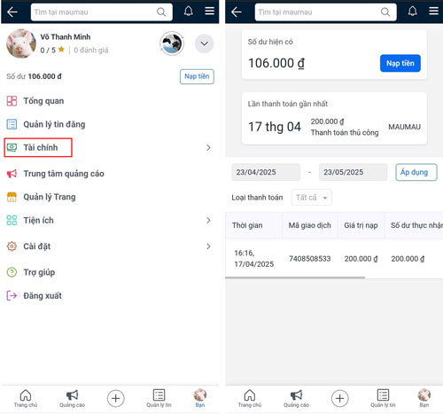 Bước 5: Quay trở lại website nhadatvui.vn, vào mục Tài chính để kiểm tra giao dịch vừa nạp.