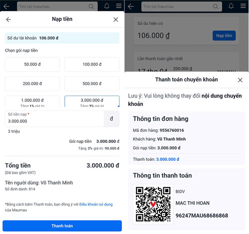 Bước 4: Nạp tiền vào hệ thống bằng cách chuyển khoản theo hướng dẫn sau: