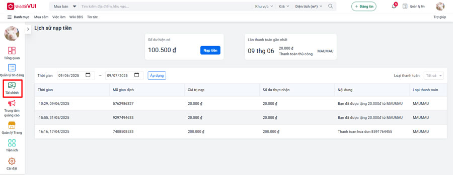 Bước 5: Quay trở lại website nhadatvui.vn, vào mục Tài chính để kiểm tra giao dịch vừa nạp.